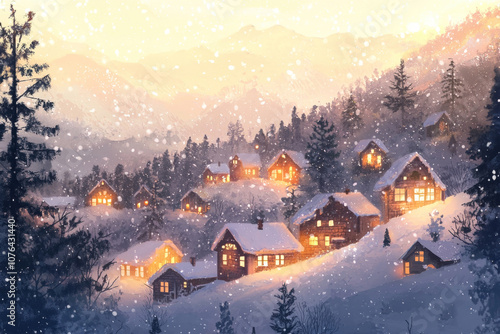 Cozy Winter Village in Snowy Mountain Landscape with Illuminated Cottages and Cabins