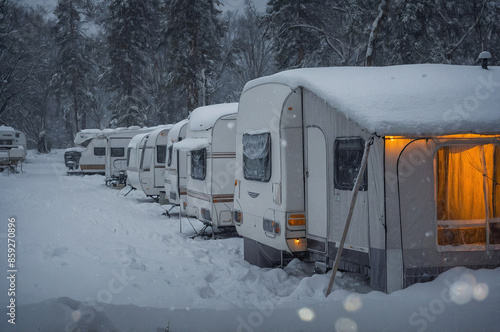Cozy wintercamping with Caravan on a campsite. Camping in the snow