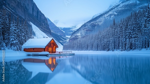 Cozy wooden cabin by a serene lake surrounded by snowy mountains and tall evergreen trees at twilight