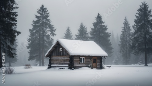 Cozy wooden cabin with a snowy roof set in a peaceful winter forest surrounded by evergreen trees