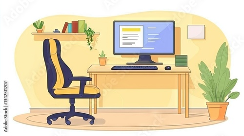 Cozy workspace setup with plants. A computer sits on a table, ready for working