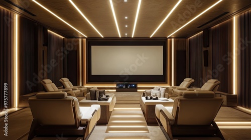 Cozy yet lavish home cinema featuring plush armchairs, a large screen, and elegant recessed lighting in the ceiling.