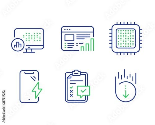 Cpu processor, Smartphone charging and Checklist line icons set. Web report, Report statistics and Scroll down signs. Computer component, Phone battery, Survey. Graph chart. Technology set. Vector