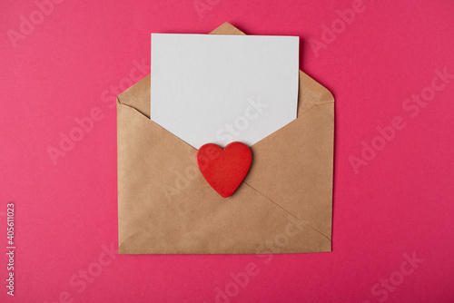 Craft envelope with a blank sheet of paper inside and red wooden heart on the hot pink background. Romantic love letter for the Valentine's day concept. Space for text.