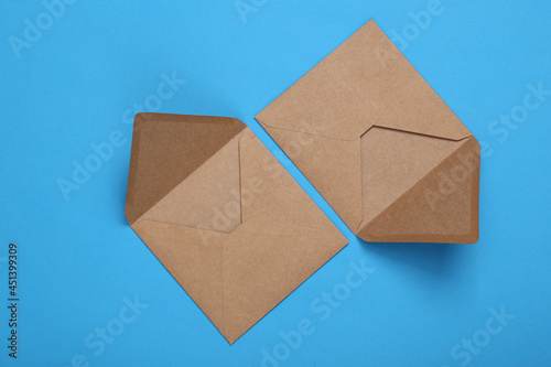 Craft envelopes on a blue background. Top view