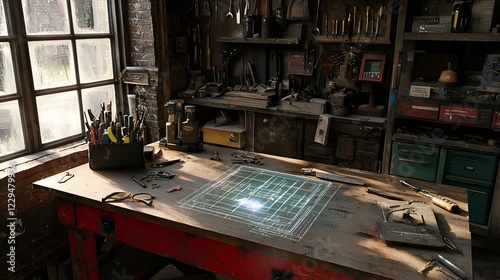 Craftsman's workshop, sunlit workbench, tools, design project