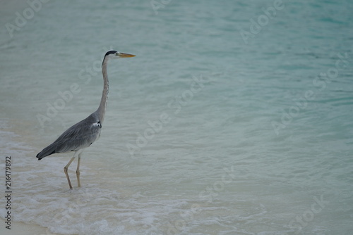 Crane standing along the beach in Baa Atoll, Maldives