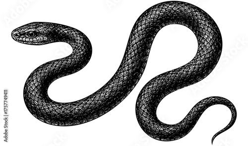 Crawling Snake – Vintage Engraving Illustration of a Snake in Elegant S-Shaped Movement with Detailed Scales, Black and White Etching, Vector and PNG Isolated on Transparent Background