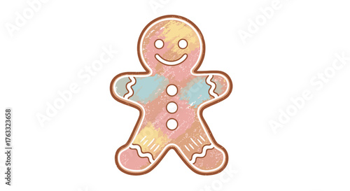 Crayon drawing of gingerbread man, smiling cookie shape, cute pastel texture, white background