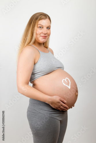 Cream on the stomach of a pregnant girl in the shape of heart. Skin care for a pregnant woman.