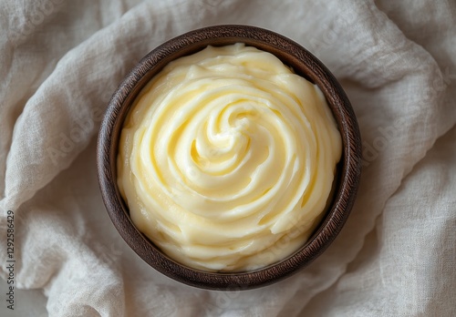 Creamy and Smooth Butter, Whipped to Perfection in a Rustic Wooden Bowl Surrounded by a Soft Linen Fabric on a Neutral Background