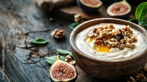Creamy Greek yogurt topped with a drizzle of honey, walnuts, and fresh figs, served in a rustic bowl with a wooden background