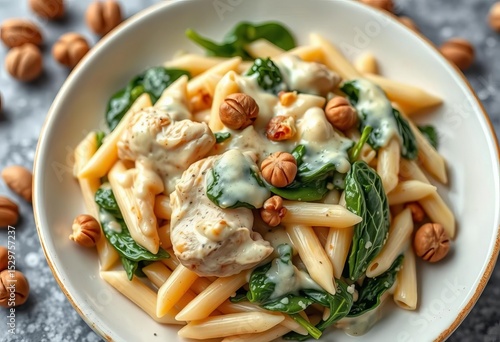 Creamy parmesan sauce coats penne pasta, tender chicken, spinach, and crunchy hazelnuts, hazelnut pasta, cooking