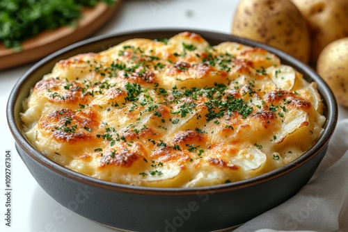 Creamy potato gratin with cheesy topping.