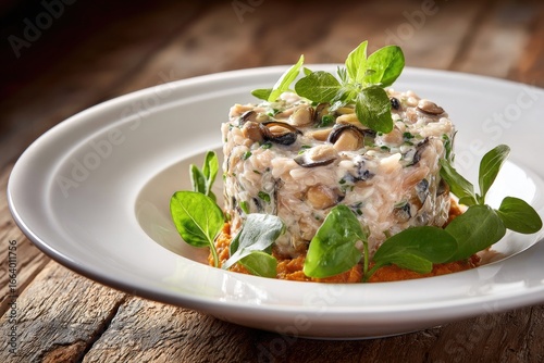 Creamy risotto dish topped with herbs and a sauce