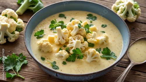 Creamy vegetarian cauliflower cheese soup on rustic wood
