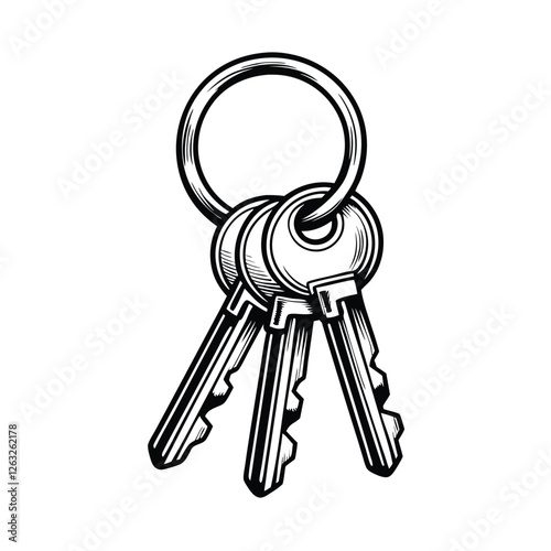 Create a clean, editable stroke vector illustration of a keychain featuring multiple attached items, suitable for branding or design projects.
