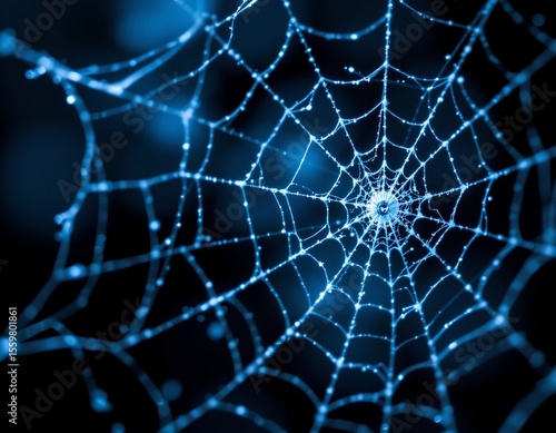 create a hauntingly beautiful image featuring a close up of a creepy white cobweb on a black background with electric blue tones