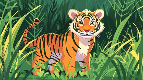 Create a illustration of a Bengal Tiger in Grasslands A Bengal tiger in tall grassin a kawaii style, simplified to feature fewer elements for a cleaner look, Use a color palette that is appea