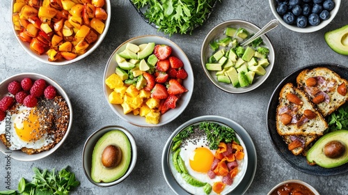 create a photographe of breakfast health-focused options such as acai bowls, avocado toast, protein smoothies, plant-based dishes, and sustainable ingredients.