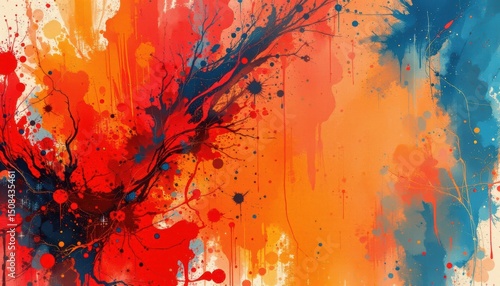 create a visually striking image using ink and paint to create a warm and inviting color palette of red, golden, and blue hues