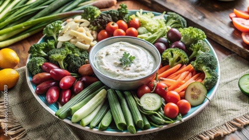 Creating a stunning vegetable platter with dip at home for entertaining guests in a warm kitchen setting