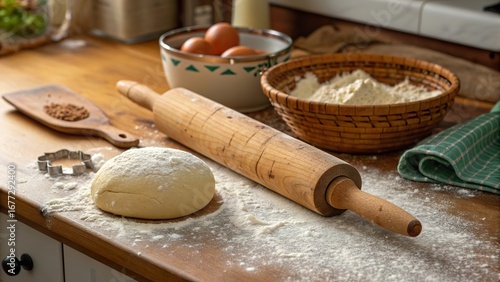 Creating homemade delights with a wooden rolling pin on a rustic countertop surrounded by fresh ingredients and baking supplies