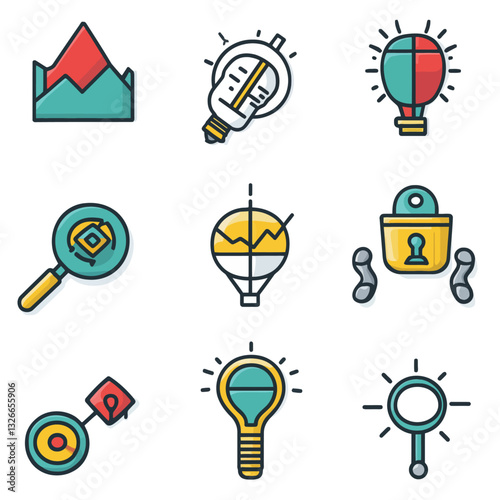 Creative Business Icons: Graphs, Ideas, Charts, Magnifying Glass, Lock