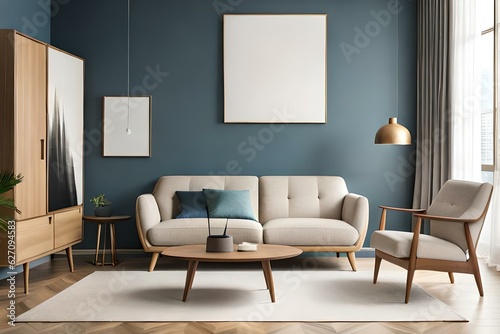 Creative composition of living room interior with blank mock up poster frame, boucle sofa, stylish lamp, wooden shelf and personal accessories