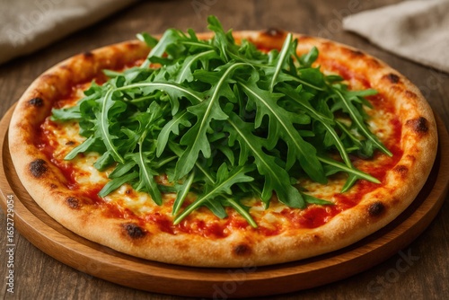 Creative homemade pizza presentation on a wooden board garnished with rucola and vegetables