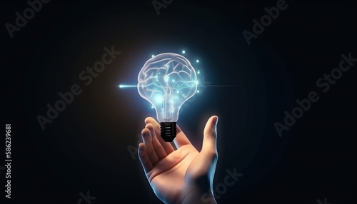 Creative, new ideas and innovation, Hand holding light bulb and smart brain inside and innovation icon network connection on dark blue city background, innovative technology in science and industrial