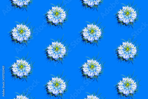 Creative pattern made of Nigella damascena, love-in-a-mist, ragged lady or devil in the bush on blue background. Gardening, nature composition.