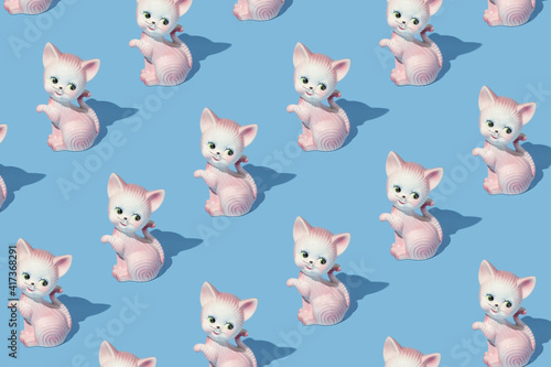 Creative pattern made with pastel pink cat or kitten vintage figurine on pastel blue background. Retro aesthetic idea. Romantic, fun and happy concept.
