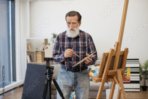 Creative pensioner blogging own painting technique and skill while staying in comfortable home studio. Senior artist looking at camera of cellphone attached to black tripod and recording video guide.