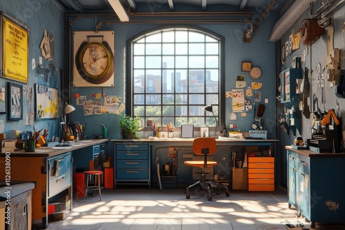 Creative workspace organization urban studio interior design bright atmosphere wide-angle view productivity inspiration
