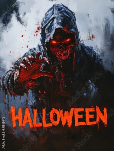 creepy demon in hell on halloween. inscription "HALLOWEEN"