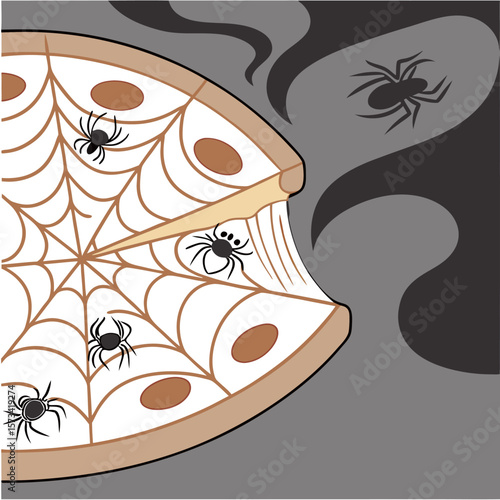 Creepy halloween pizza slice adorned with a detailed spiderweb and several spooky spiders crawling across the cheesy topping with a dark smoky background