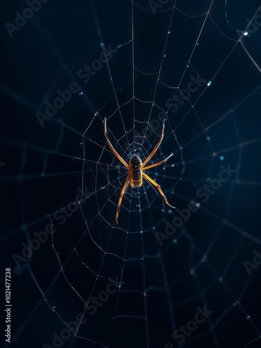 Creepy white spider web of wild spider with tiny drops of water shining in light on dark blue background scary cobweb for halloween party closeup backdrop with copy space halloween backdrop