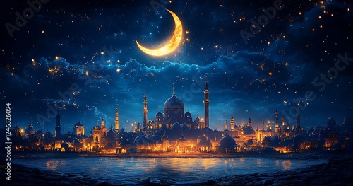 Crescent Moon Over Illuminated City Skyline with Minarets and Starry Sky