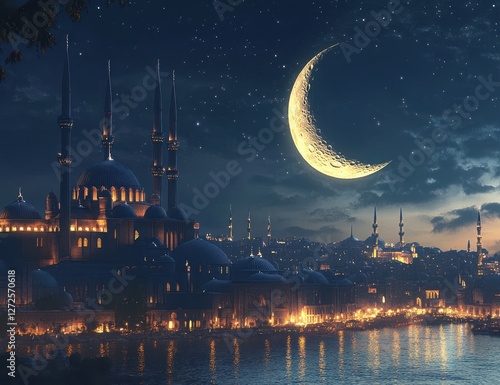 Crescent moon over Istanbul mosques at night