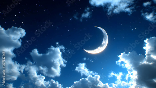 Crescent moon shining brightly in a night sky filled with fluffy clouds and distant stars; ideal for peaceful, dreamy backgrounds