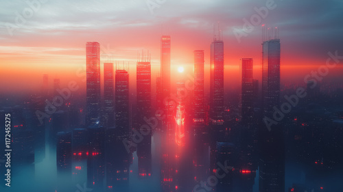 Crimson Skyline: Futuristic City at Sunset