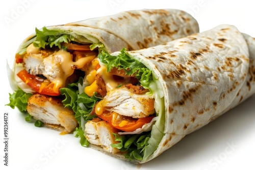 Crispy chicken wrap with lettuce, melted Mozzarella, yellow or honey sauce, tortilla wrap with chicken and vegetables isolated on white