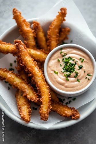 Crispy fried chicken strips with creamy dipping sauce and chives