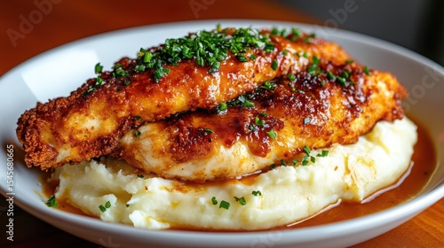 Crispy Fried Fish Fillets on Creamy Mashed Potatoes with Gravy