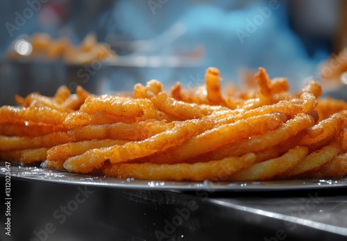 Crispy Golden Fried Churros Stacked on a Plate in a Street Food Setting with a Blurred Background of a Vibrant Market Atmosphere