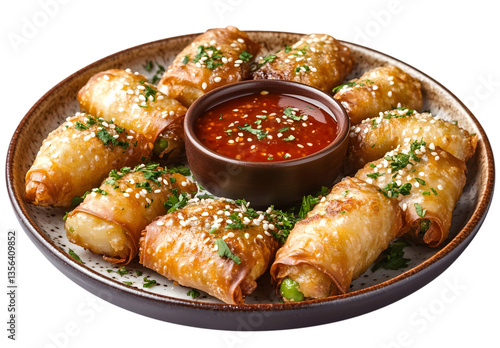 Crispy spring rolls appetizer with dipping sauce garnished with sesame seeds and parsley