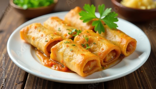 Crispy spring rolls arranged on white plate, cilantro garnish, photography, eat