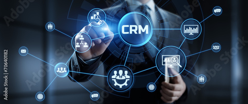 CRM Customer relationship management concept. Businessman pressing button on screen.