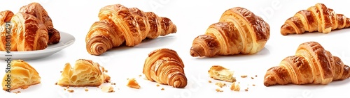 Croissants that fresh and delicious falling in the air isolated on background, Breakfast time, popular plain croissant breads.pmg